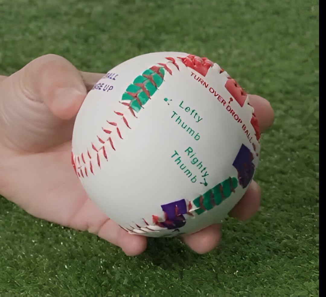 The Pitch Training Baseball is a specially designed ball that features printed finger placement marks to teach beginners and young players how to grip and throw different types of pitches correctly.